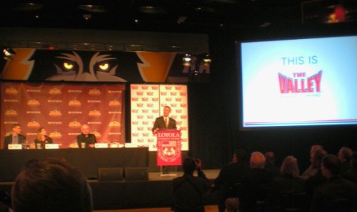 MVC Commissioner Doug Elgin announces Loyola as a new member of the Missouri Valley Conference on April 19, 2013. (Photo by John C. Thomas)